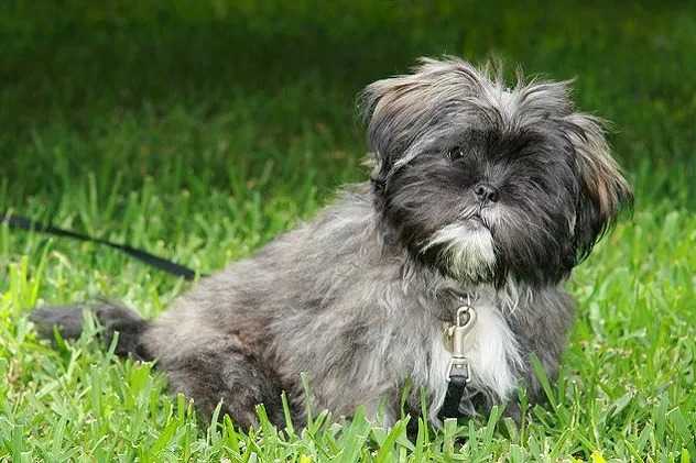 Un Lhatese au pelage bicolore, assis sur une surface herbacée et qui est tenu en laisse