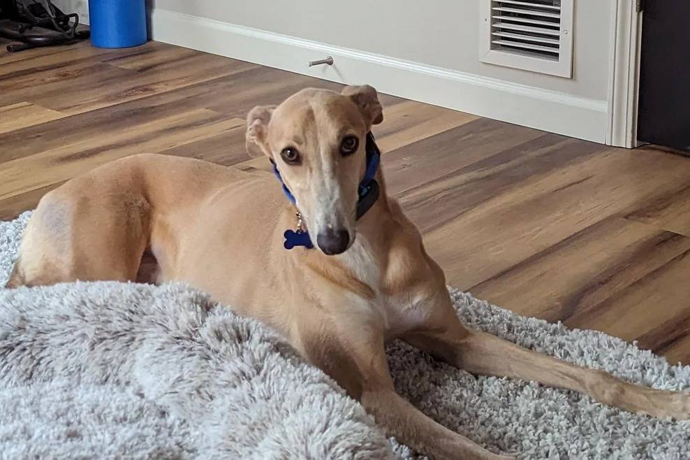 Un Lurcher allongé sur un tapis et portant un collier autour du cou