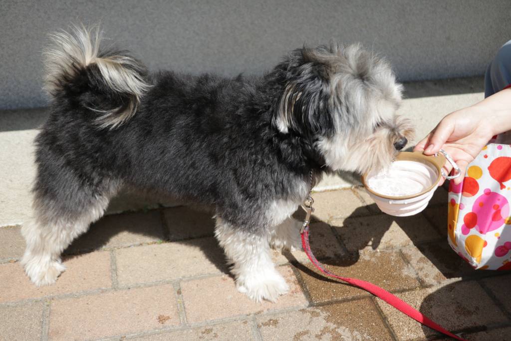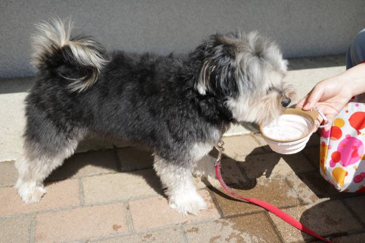 Un Mal-Shi au pelage gris, buvant dans une gamelle tendue par sa maîtresse