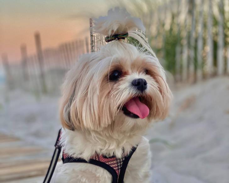 Un Mal-Shi au pelage beige, assis sur un ponton en bois