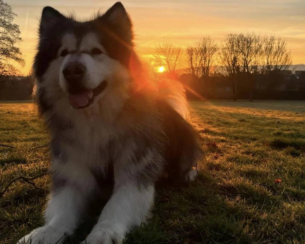 Un Malamute d'Alaska allongé sur un terrain herbeux