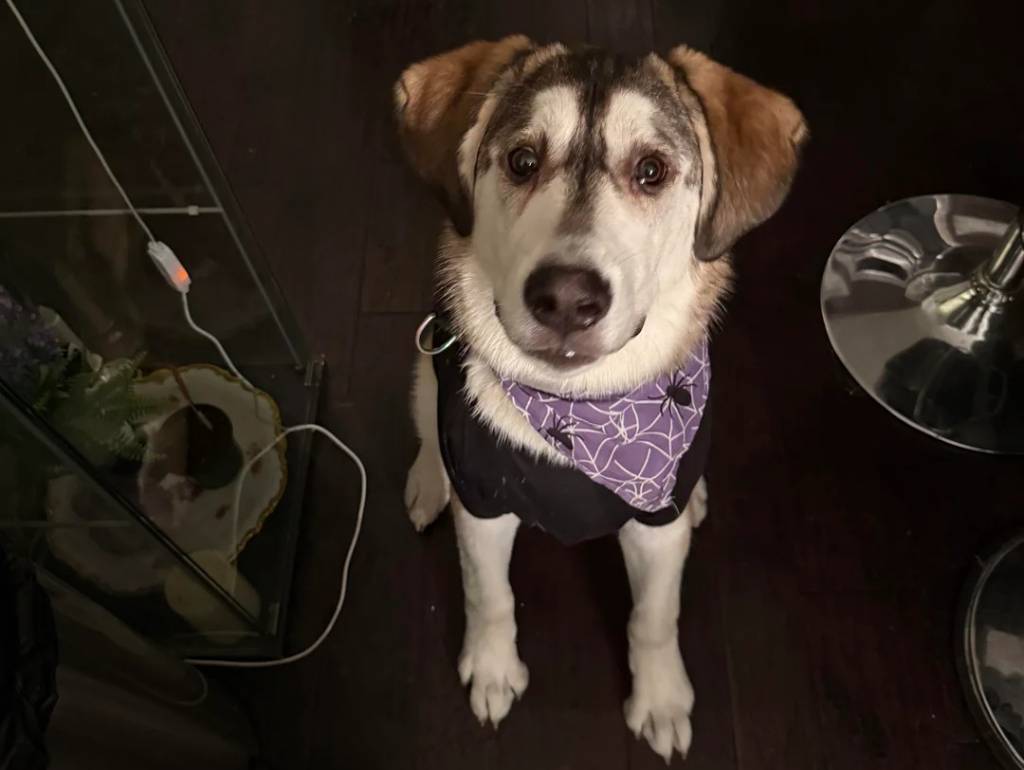 Un Malamute d'Alaska assis et portant un foulard autour du cou