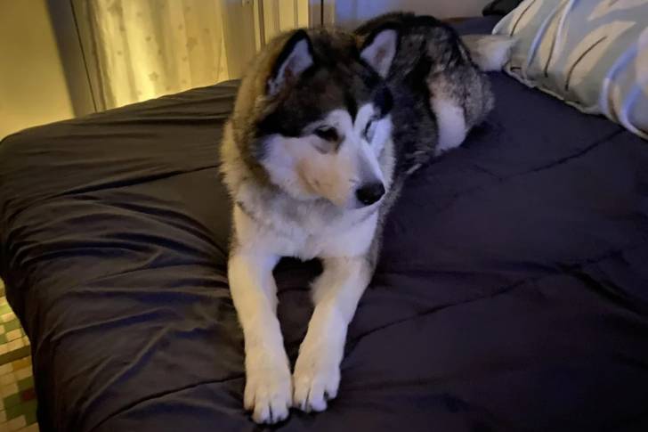 Un Malamute d'Alaska allongé sur un lit