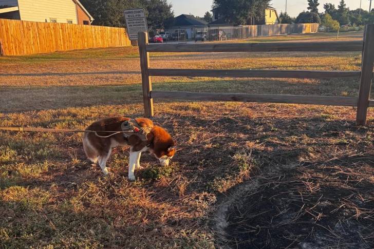 Un Malamute d'Alaska sur un terrain herbeux et tenu en laisse