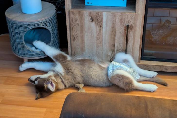 Un Malamute d'Alaska allongé de dos sur un plancher en bois