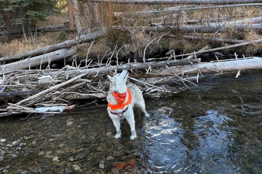 Un Malamute d'Alaska dans l'eau et portant un foulard autour du cou