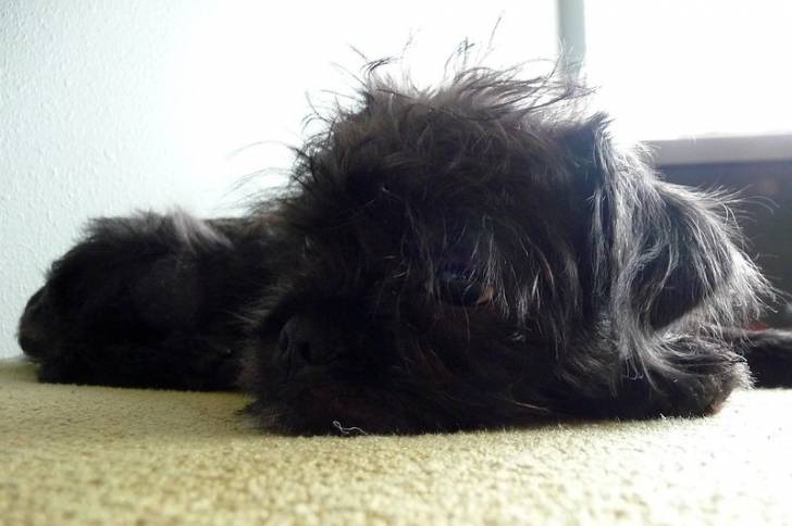 Un Malti-pug noir couché sur un tapis beige