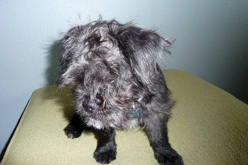 Un Malti-pug noir à poil ébouriffé assis sur un coussin vert