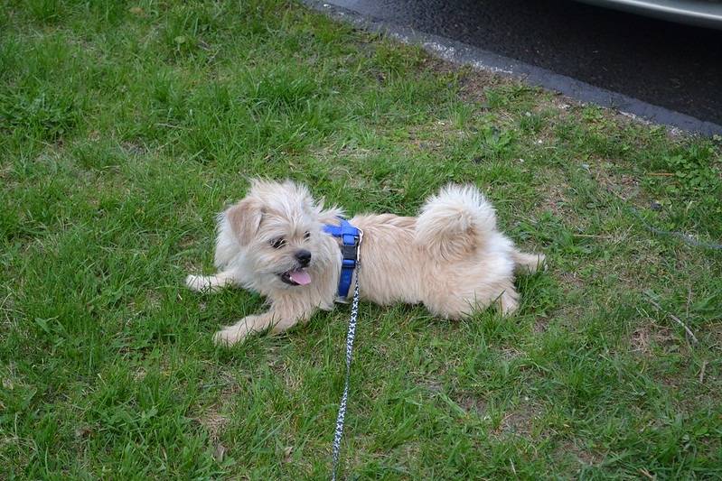 Un Malti-pug portant un harnais bleu et couché sur une pelouse herbeuse