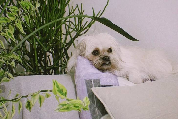Un Malti-Pug reposant sa tête sur un oreiller violet