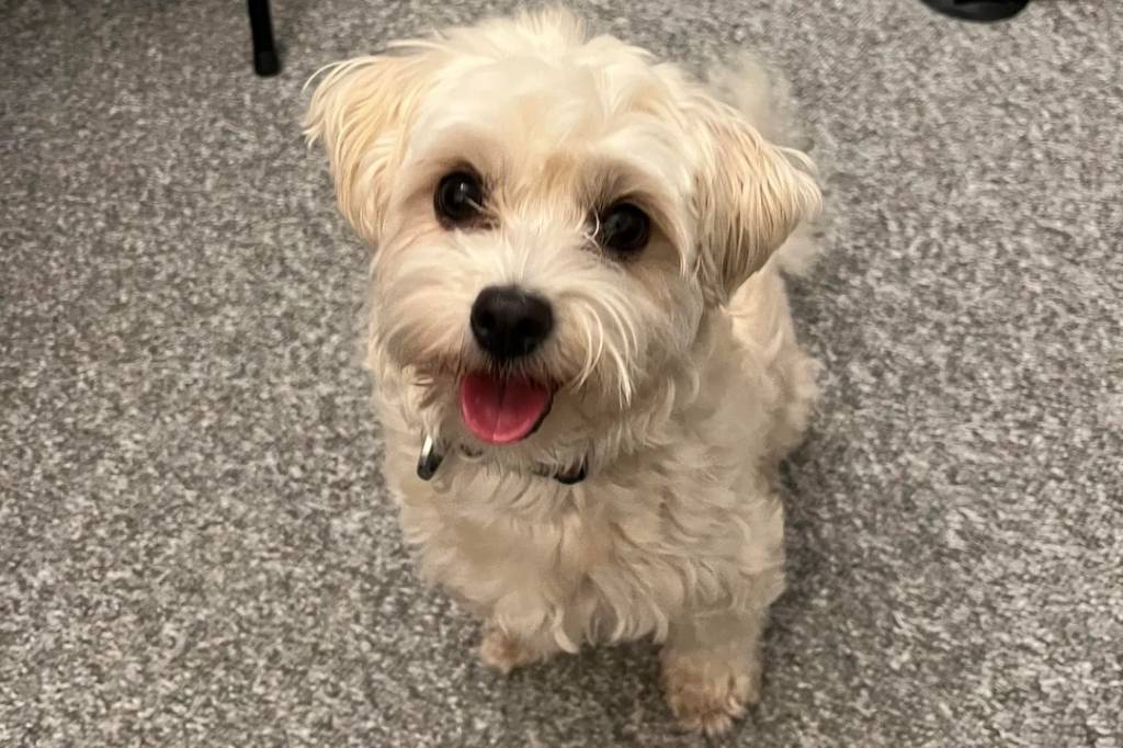 Un Maltipoo assis sur une moquette et portant un collier autour du cou