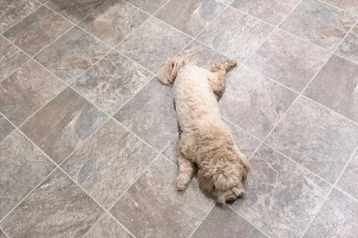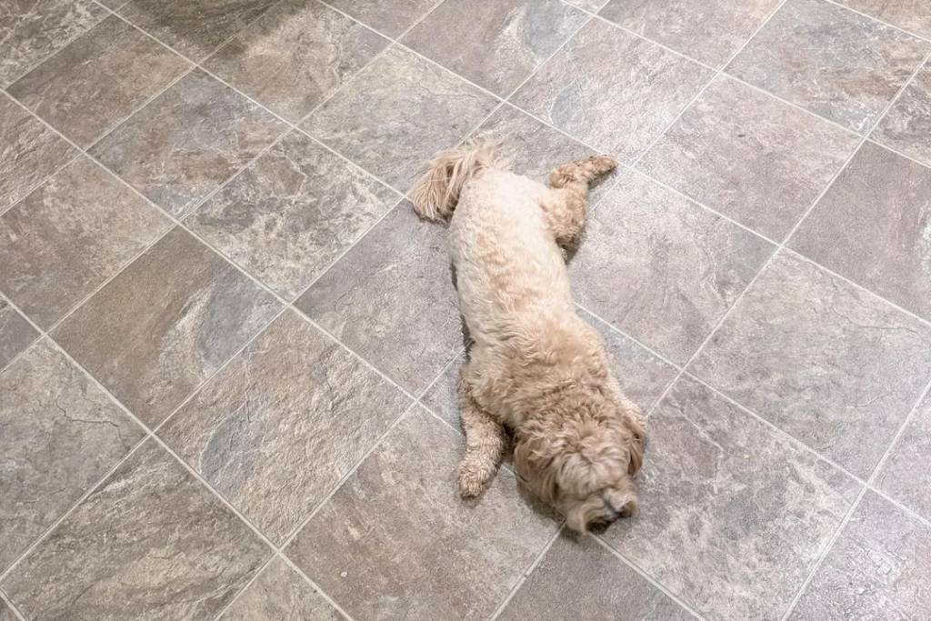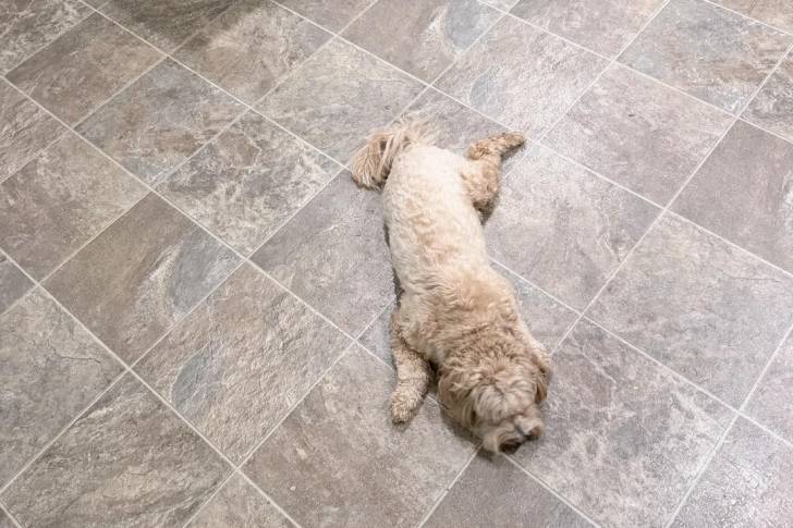 Un Maltipoo allongé sur un sol carrelé