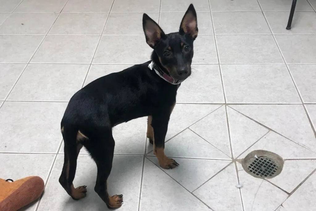 Un Manchester Terrier sur un sol carrelé et regardant vers la caméra