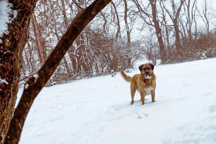 Un Mastiff d'Anatolie sur une surface enneigée et portant un collier autour du cou