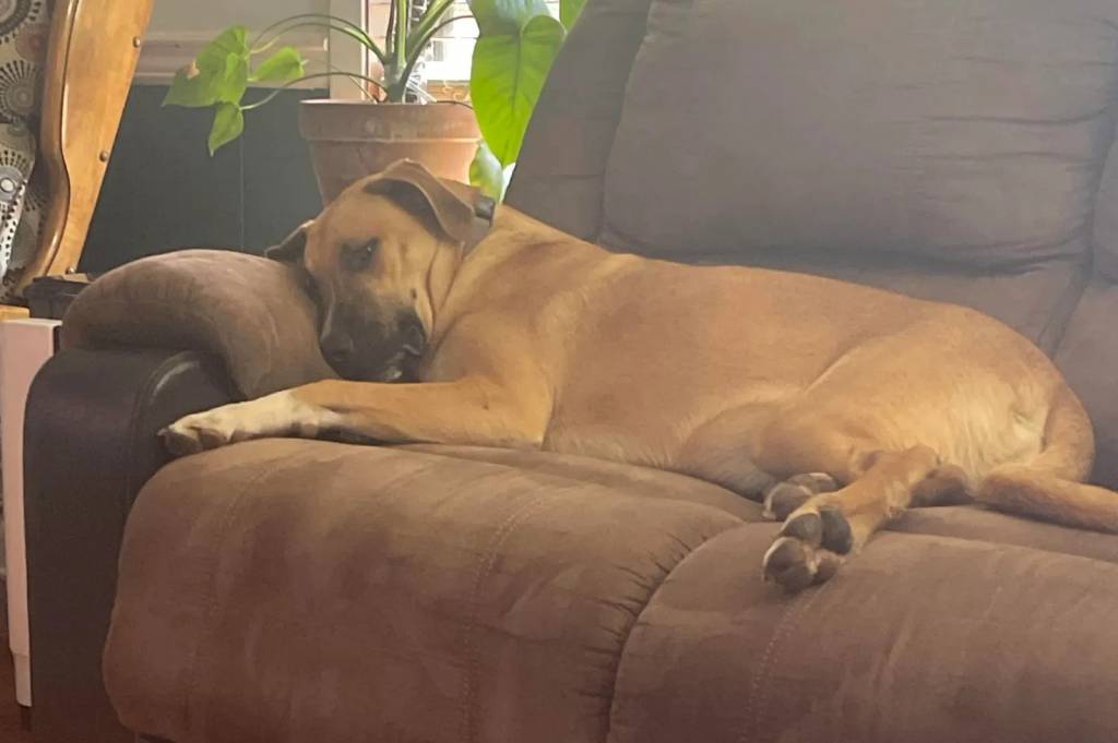 Un Mastiff d'Anatolie allongé sur un canapé et semblant détendu
