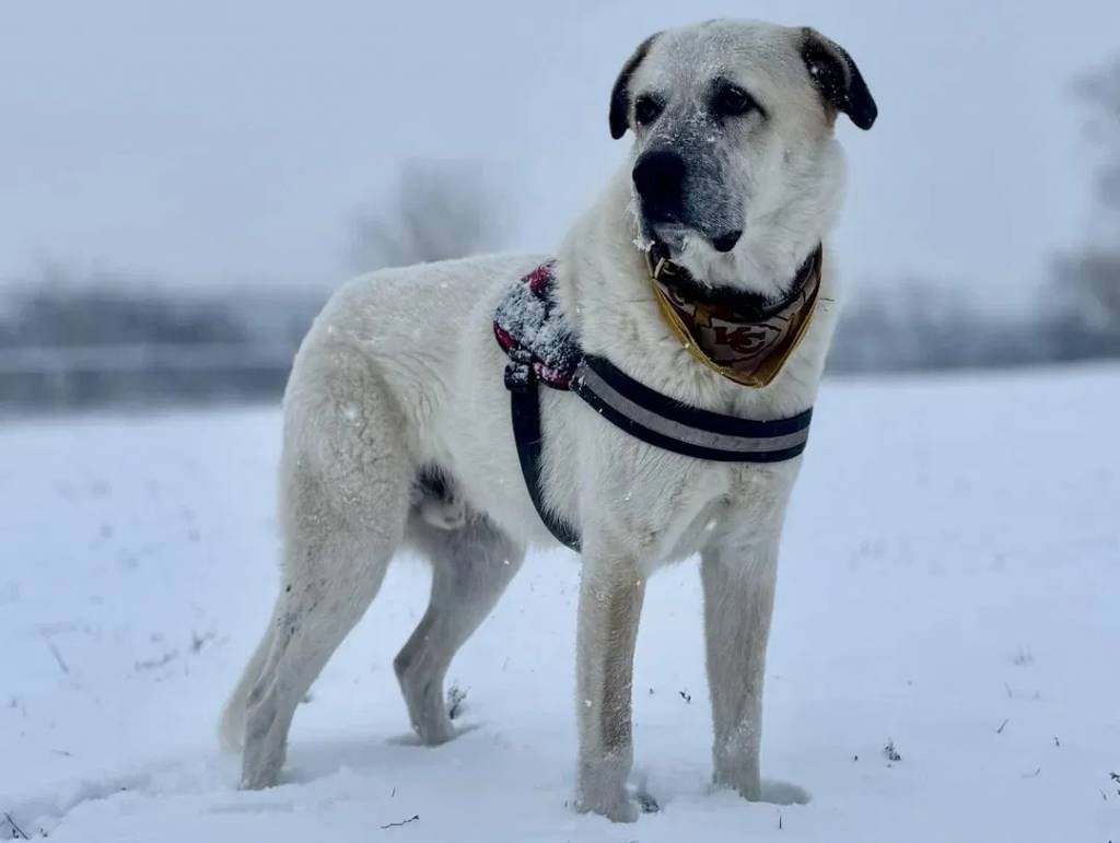 Un Mastiff d'Anatolie sur une surface enneigée et portant un harnais