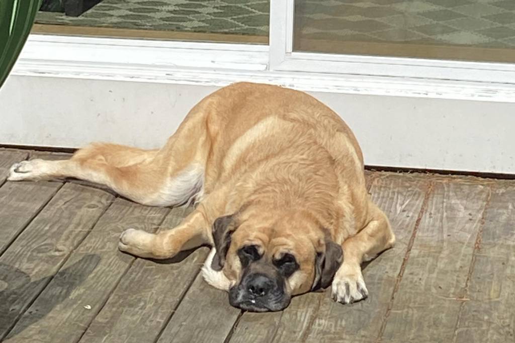 Un Mastweiler allongé sur un plancher et regardant vers la caméra