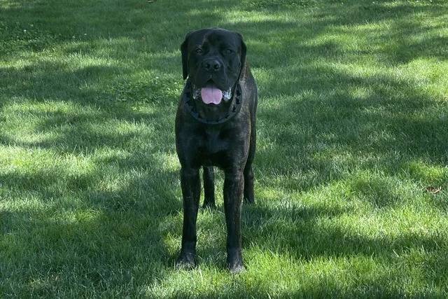 Un Mastweiler sur un terrain herbeux tirant la langue et portant un collier autour du cou