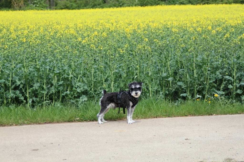 Un Miniature French Schnauzer regardant vers la caméra et portant un harnais