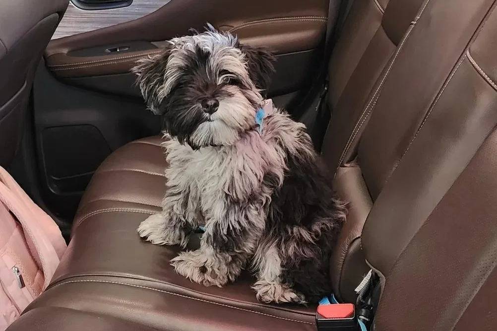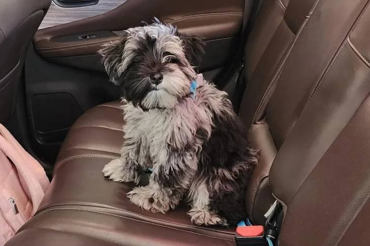 Un Miniature French Schnauzer assis sur la banquette arrière d'une voiture et portant un collier autour du cou
