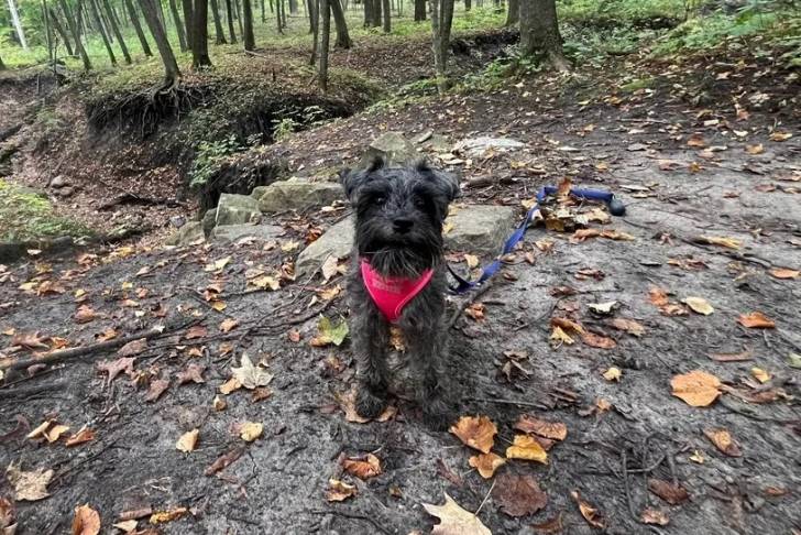 Un Miniature French Schnauzer assis sur un sol jonchés de feuilles mortes et qui est tenu en laisse