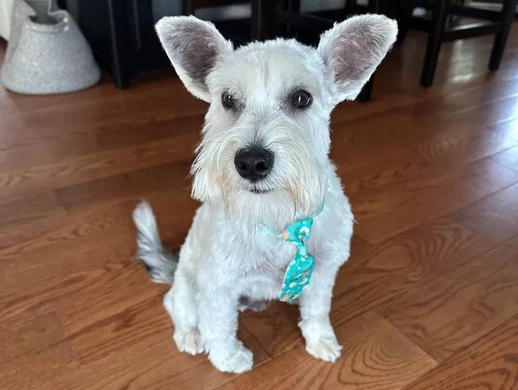 Un Miniature French Schnauzer assis sur un plancher et portant un collier autour du cou