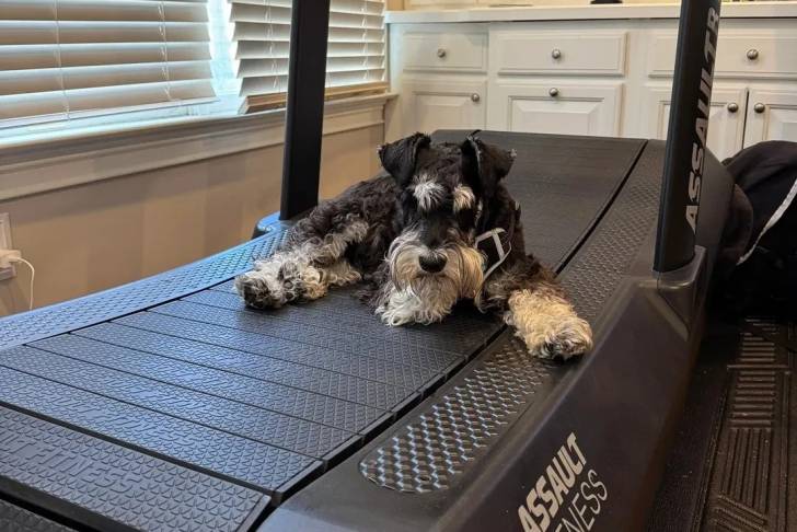 Un Miniature French Schnauzer allongé sur un tapis de course et portant un harnais