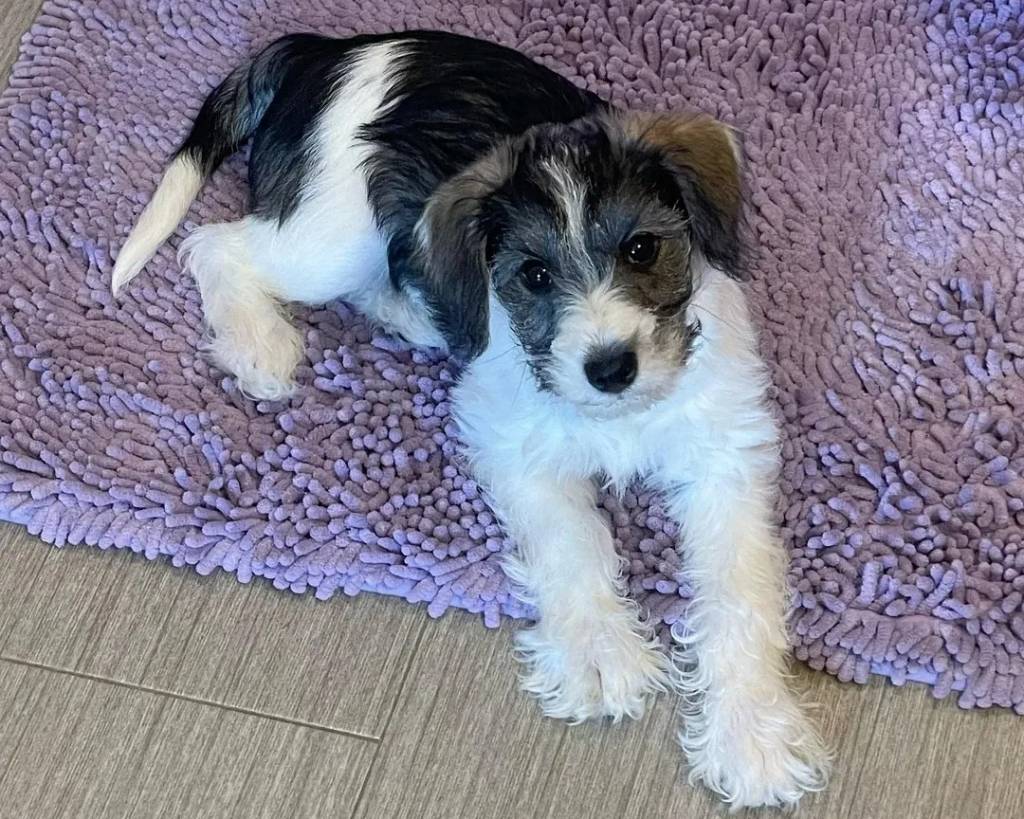 Un Miniature French Schnauzer allongé sur un tapis et regardant vers la caméra