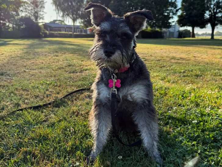 Un Miniature French Schnauzer assis sur un terrain herbeux et qui est tenu en laisse