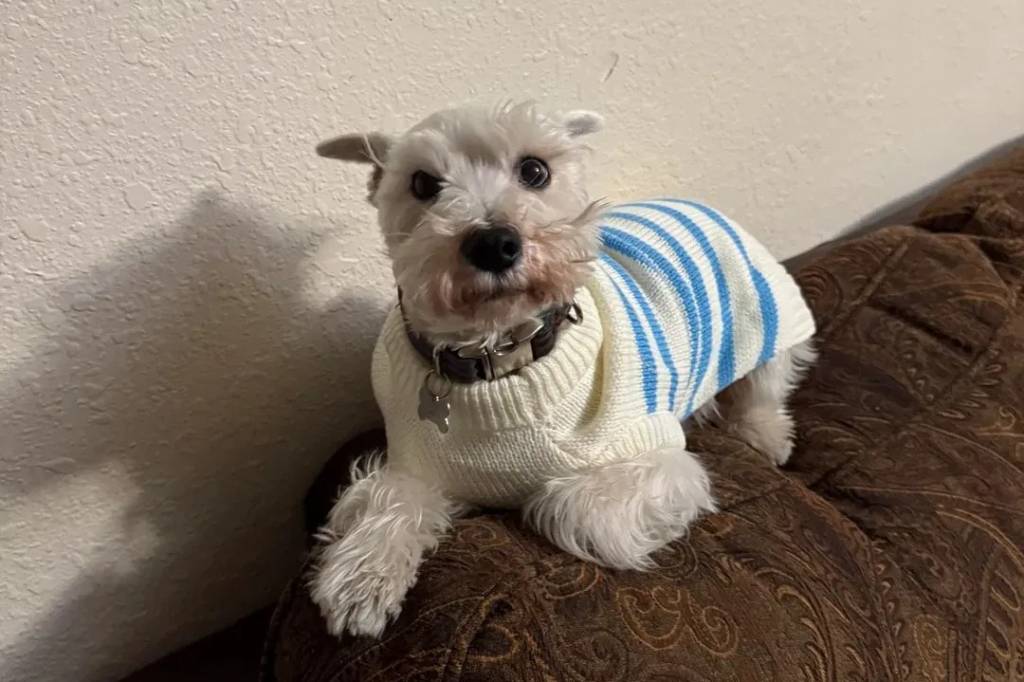 Un Miniature French Schnauzer portant un habit pour chien et un collier autour du cou