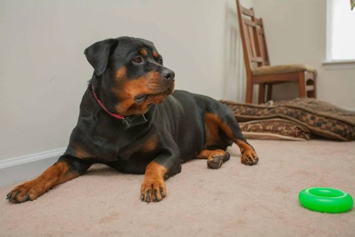 Un Miniature Rottweiler allongé sur une moquette et portant un collier autour du cou