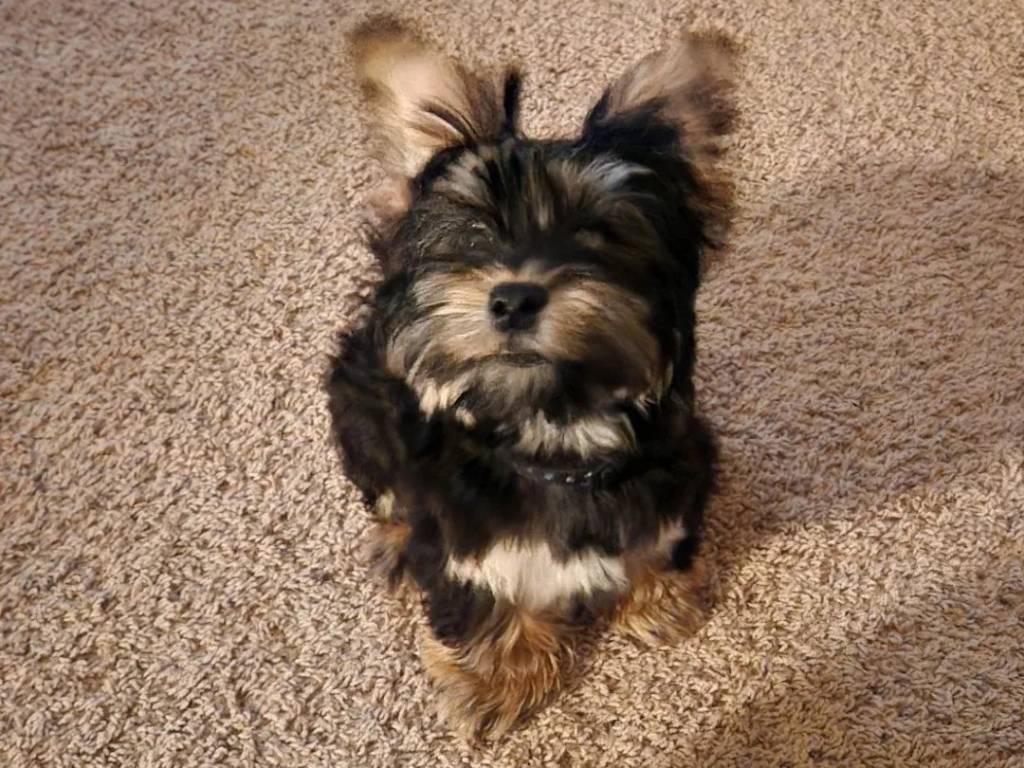 Un Morkie assis sur une moquette
