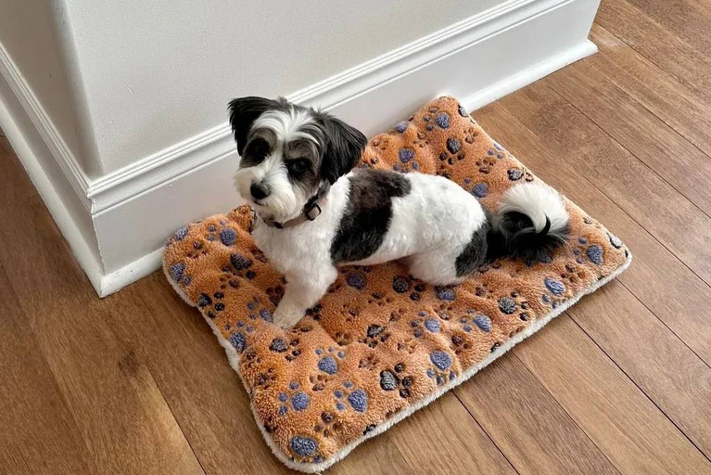 Un Morkie assis sur un lit pour chien et portant un collier autour du cou