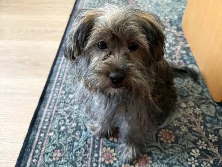 Un Morkie assis sur un tapis et regardant vers la caméra