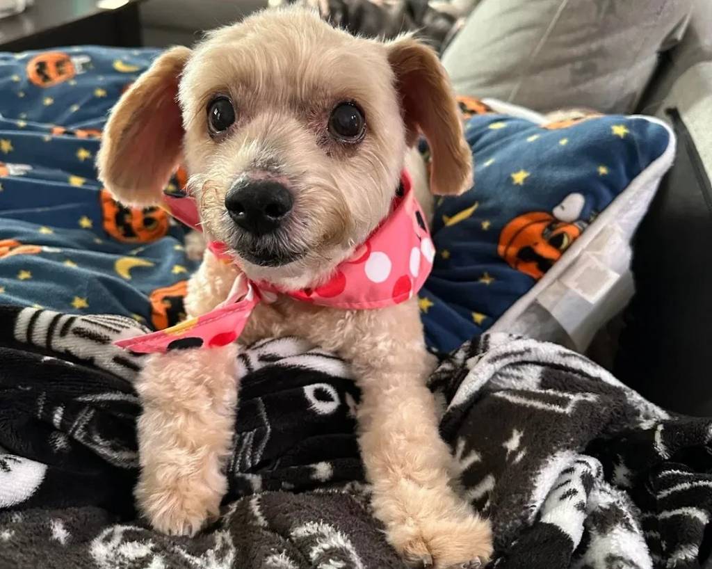 Un Morkie allongé et portant un foulard