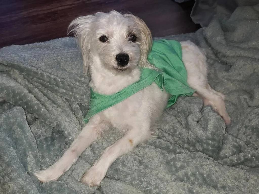 Un Morkie allongé et portant un habit pour chien