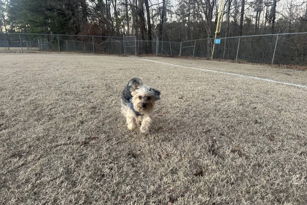 Un Morkie marchant sur une surface herbacée et portant un harnais