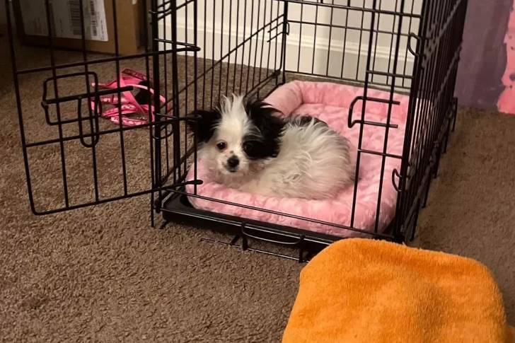 Un Morkie allongé dans une cage
