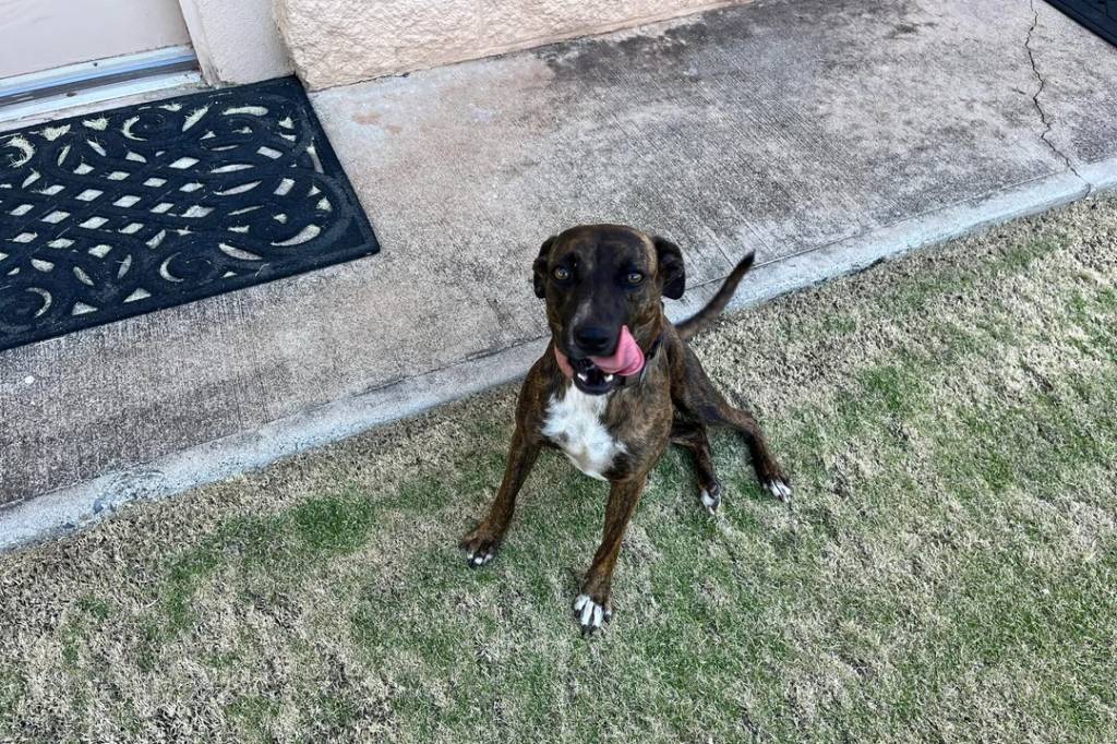 Un Mountain Cur assis sur un terrain herbeux et portant un collier autour du cou