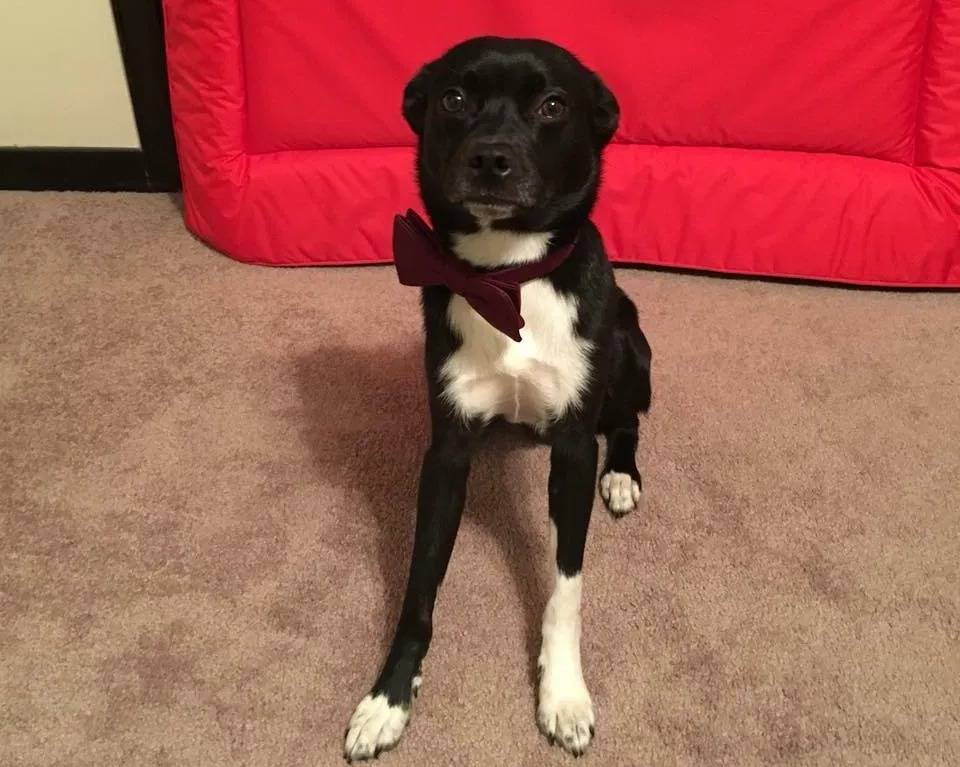 Un Mountain Feist assis sur une moquette et portant un nœud autour du cou