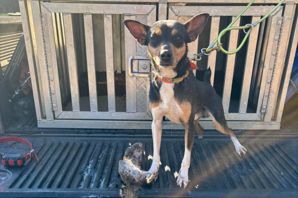 Un Mountain Feist regardant vers la caméra et qui est tenu en laisse