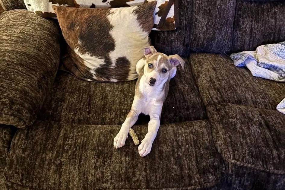 Un Mountain Feist allongé sur un canapé et regardant vers la caméra