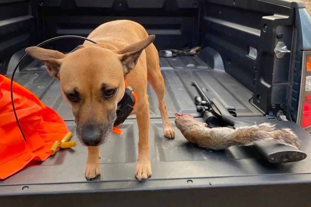 Un Mountain Feist dans la benne d'un pick-up et portant un collier autour du cou