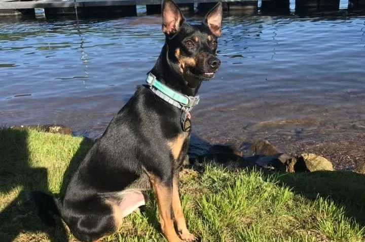 Un Mountain Feist assis sur un terrain herbeux et portant un collier autour du cou