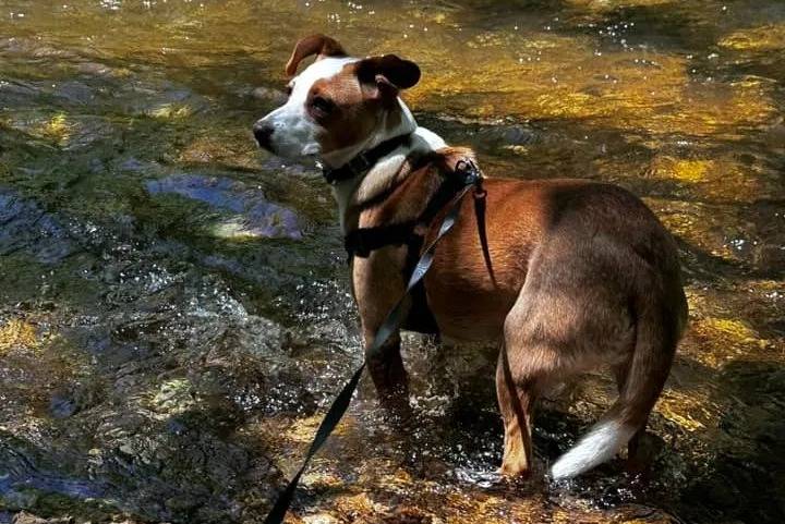 Un Mountain Feist dans l'eau et qui est tenu en laisse