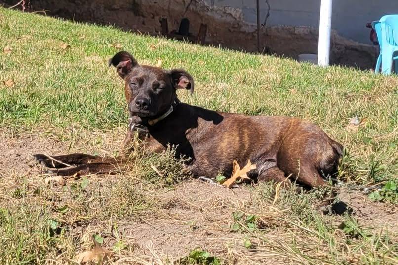 Un Mountain Feist allongé sur une surface herbacée et portant un collier autour du cou