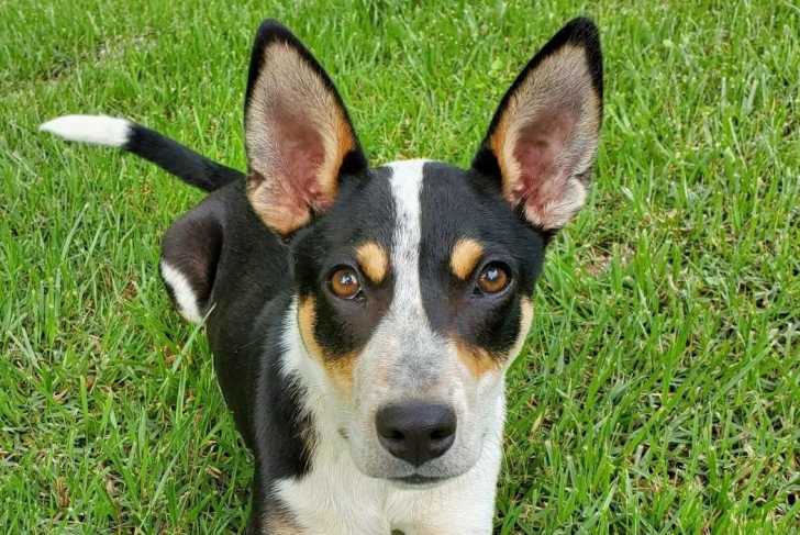 Un Mountain Feist allongé sur un terrain herbeux et regardant vers la caméra