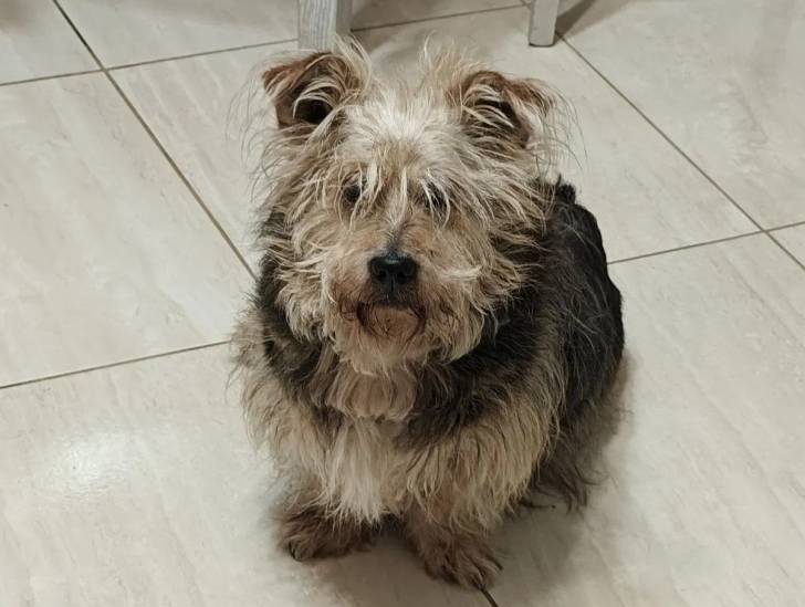Un Norfolk Terrier assis sur un sol carrelé et regardant vers la caméra