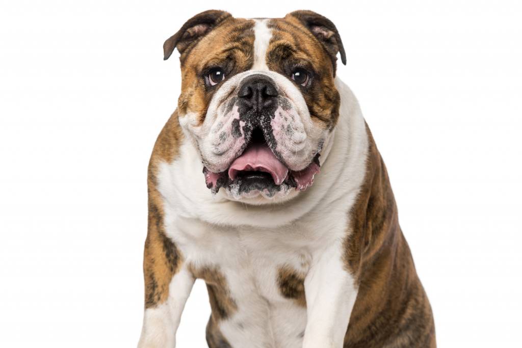 Un Olde English Bulldogge adulte au pelage blanc et marron tire la langue, assis dans une pièce blanche