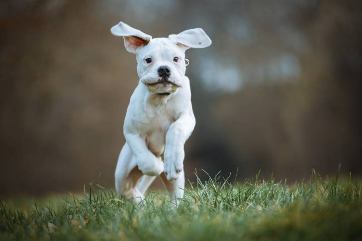 Un jeune Olde English Bulldogge en stage d'éducation canine